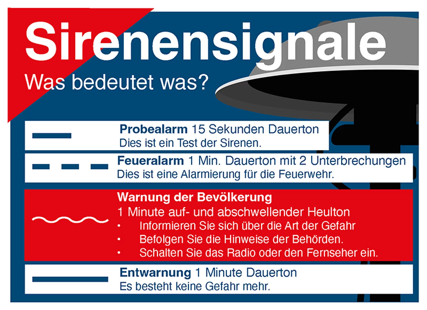 Der einminütige auf- und abschwellende Dauerton dient zur Warnung der Bevölkerung. Der Ton fordert auf, Radio oder Fernsehen einzuschalten oder sich anderweitig über drohende Gefahren zu informieren. - Entwarnung