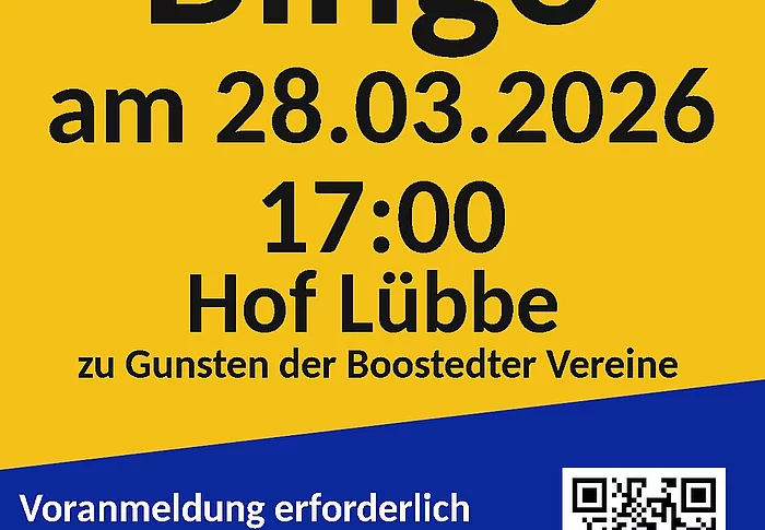 Zur Bingo Veranstaltung sm 28.03.2026 um 17 Uhr im Hof Lübbe lädt die Unabhängige Wählergemeinschaft Boostedt e.V. ein.