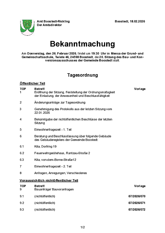 Boostedt: Sitzung des Bau- und Konversionsausschusses